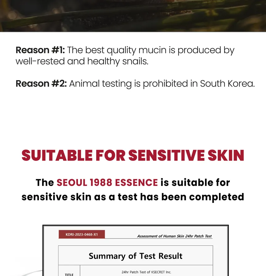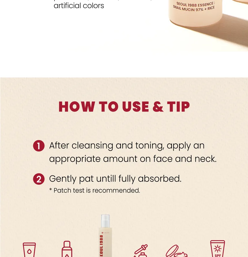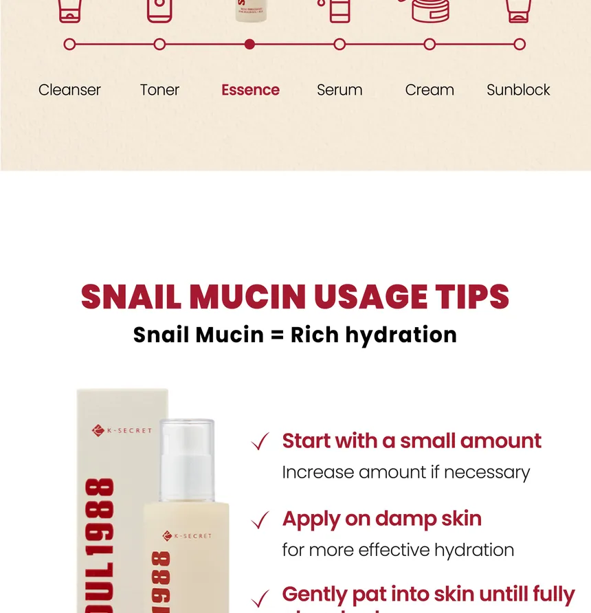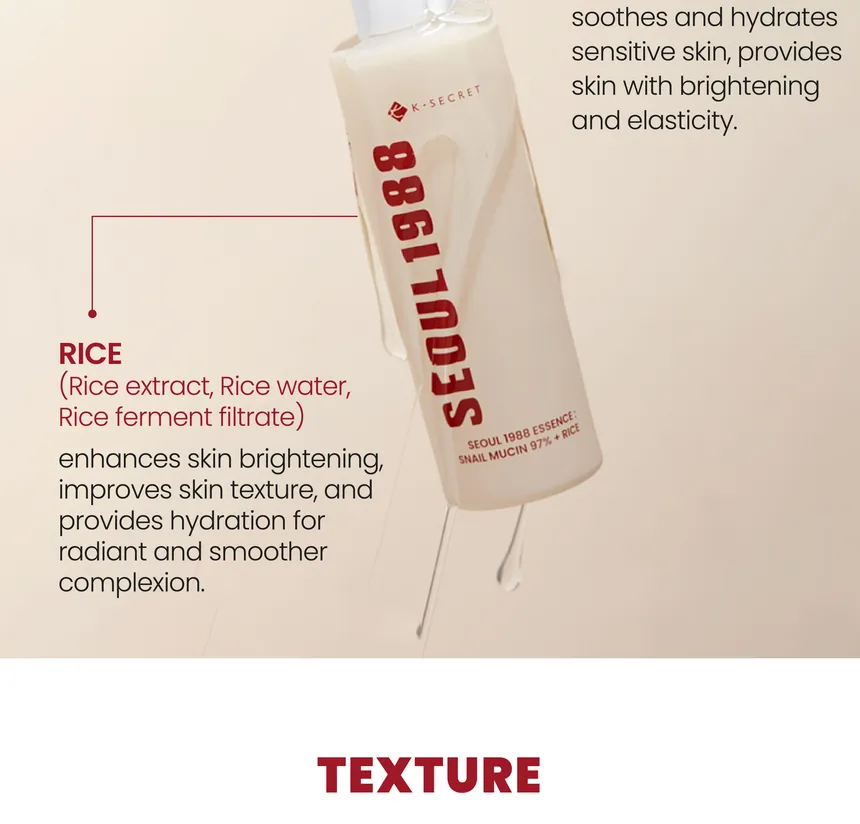 إيسنس مغذٍ يحتوي على 97% من مخاط الحلزون مع مستخلصات الأرز، يرطب البشرة بعمق، يساعد على إصلاحها وتفتيحها، ويحسّن ملمسها ليمنحها إشراقة صحية بملمس خفيف سريع الامتصاص.